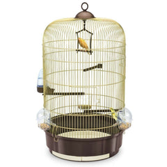 Luna es una jaula redonda para canarios y pájaros pequeños medianos, disponible en los colores de la malla, blanco combinado con fondo de plástico azul y malla de latón con fondo marrón.